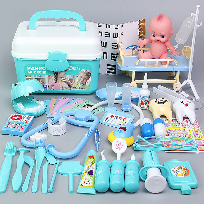 小さい医者のおもちゃの女の子の医療箱のセットの看護婦の子供は注射してシミュレーションします。