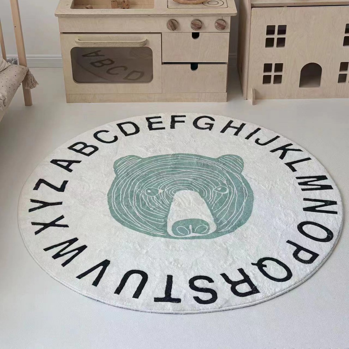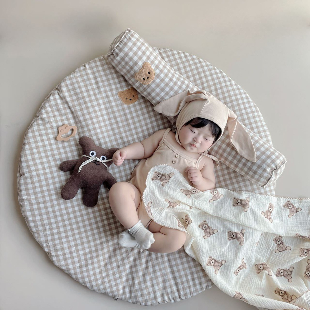 Ins新格子プリント熊刺繍マット赤ちゃん円形座布団赤ちゃん室内爬行マット