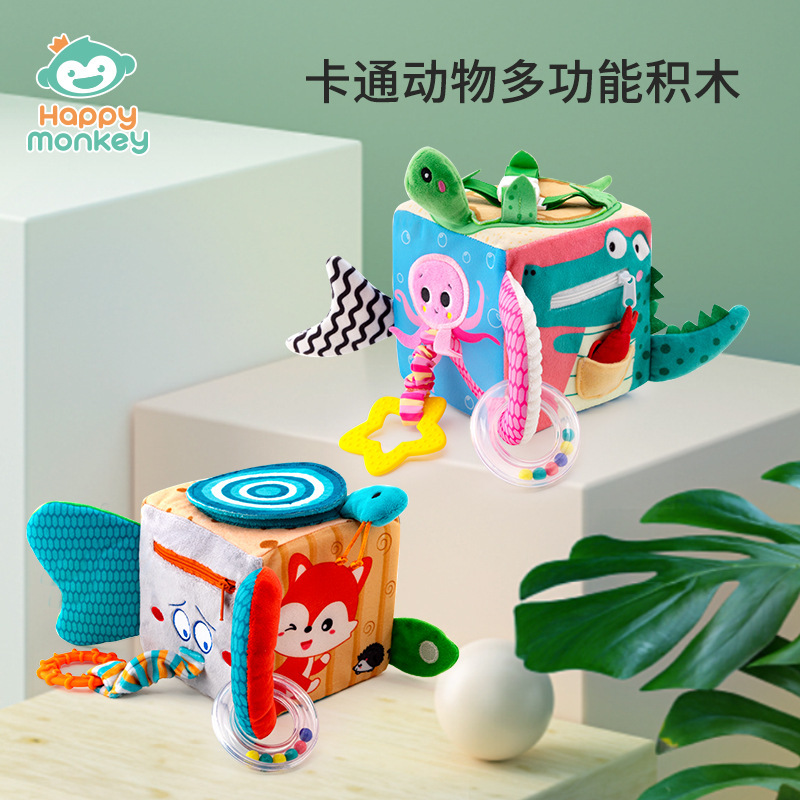 Happy monkeyの赤ちゃん六面体の積み木の鈴の赤ちゃんは服を着て柔らかい布のボールを着ます。