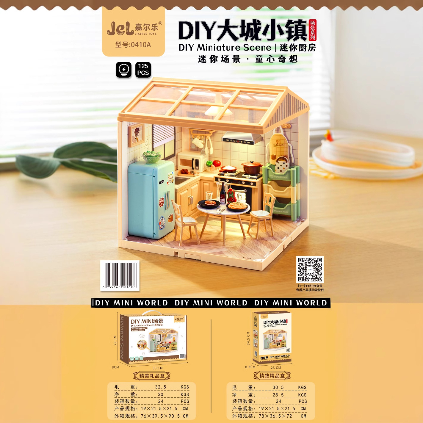 DIY小屋の大城小鎮のミニの組み合わせのシーンの小さい家の台所の立体は売店の学生のプレゼントを詰めます。