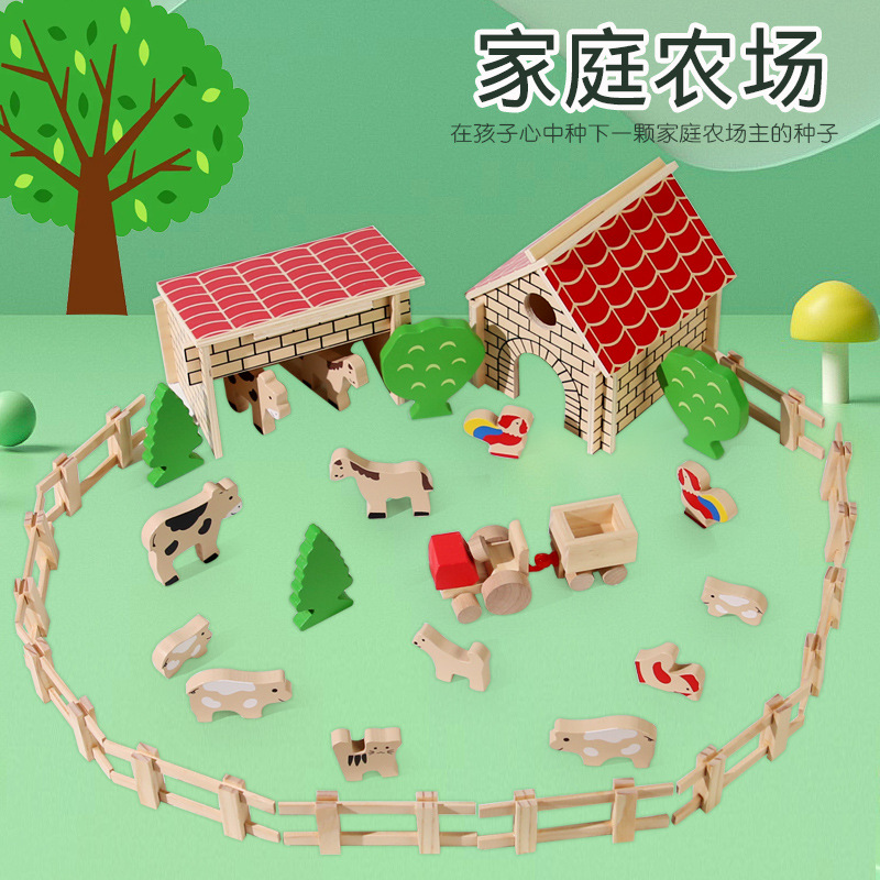 迷你家庭农场娃娃房子儿童木质动物奶牛小狗围栏宝宝拼装积木玩具