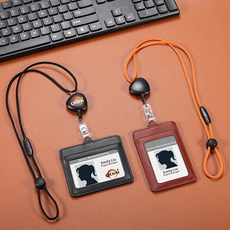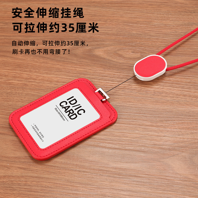 本革作業証カードカバー伸縮カードメーカーの胸カード安全ボタンは、ストラップ証明書カードカバーの首のカードをかけることができます。