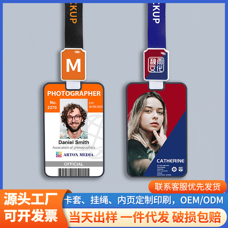 工牌カードカバーの名前は従業員の胸札に紐をつけてロゴを決めます。