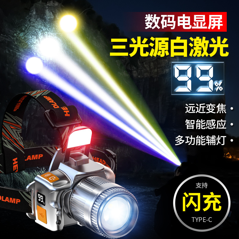 屋外ヘッドライト強い光長距離USB充電ズームヘッドライトLEDヘッドセット三色調光夜釣り感応ヘッドライト