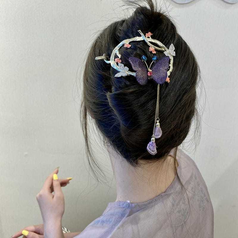 楕円形の蝶のツイストヘアピン、手刺繍のタッセルヘアアクセサリー、後頭部のヘアピン、水平クリップ