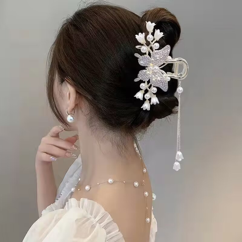 スズランの花蝶タッセルヘアピン後頭部絶妙なグリップクリップ女性の夏大型ハイエンドサメクリップ帽子