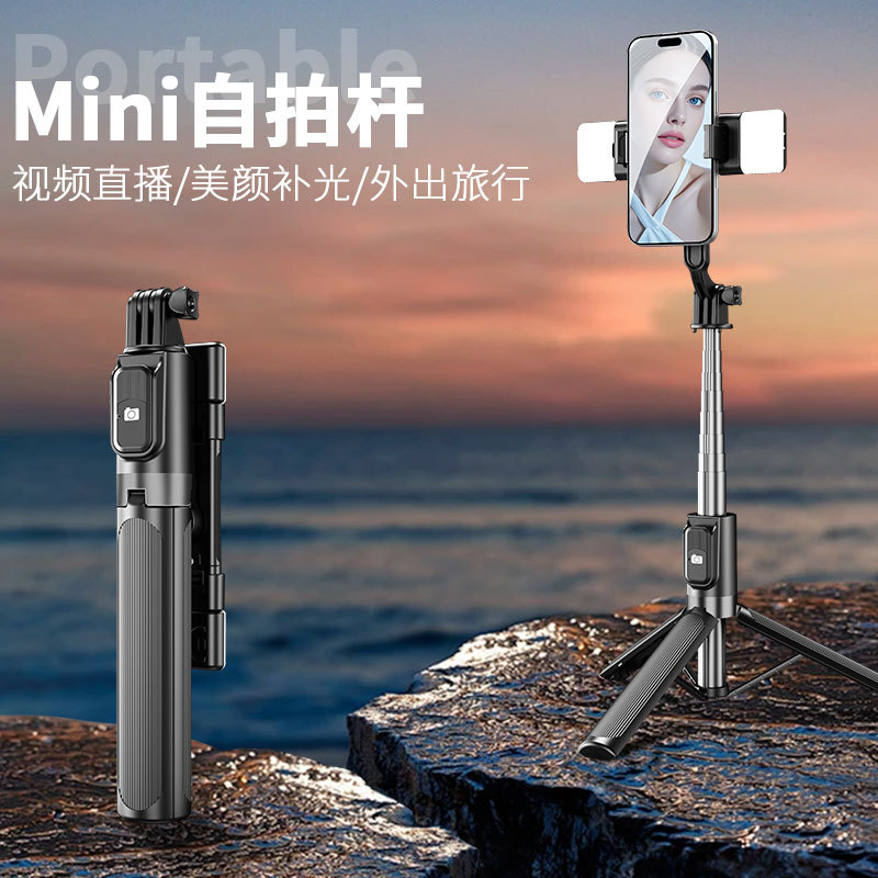 P15mini Bluetooth自撮り棒 ポータブル伸縮式スマホスタンド 旅行写真 ライブ配信 ハンドヘルド三脚 補光付き