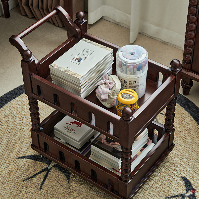 レトロな木製の移動可能なかばんの棚の小さな茶車の食堂車のソファーのそばのいくつかのフランスのカートがあります