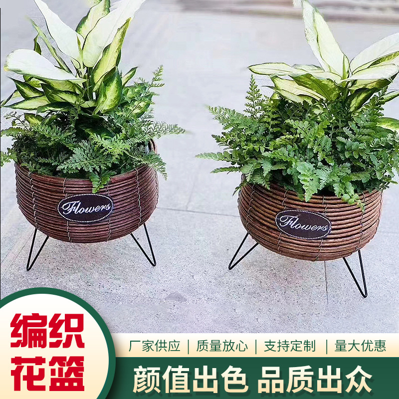 緑の植物と花のバスケット、芸術的な編み込み、鉄骨、籐編み、屋内外兼用、田園風の花棚