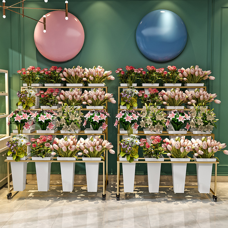 移動式多層花屋用花棚、生花・造花用鉄製フラワースタンド、フラワーバケツ展示台