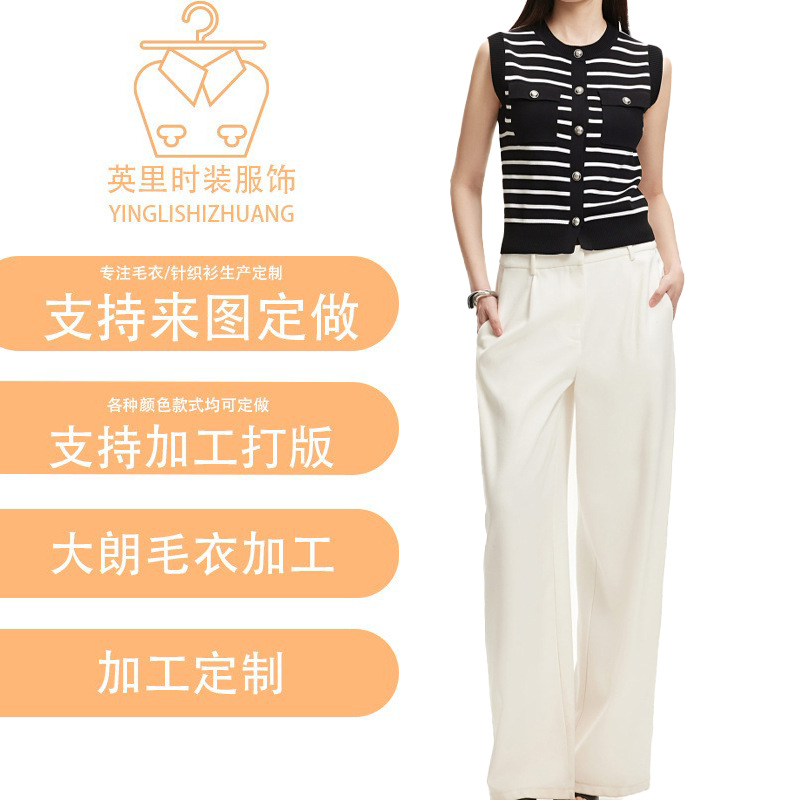 女性のカジュアルファッションストライプコントラストスクエアカラーショートニットベスト大朗ウール織りサンプルパターンとカスタマイズされた写真