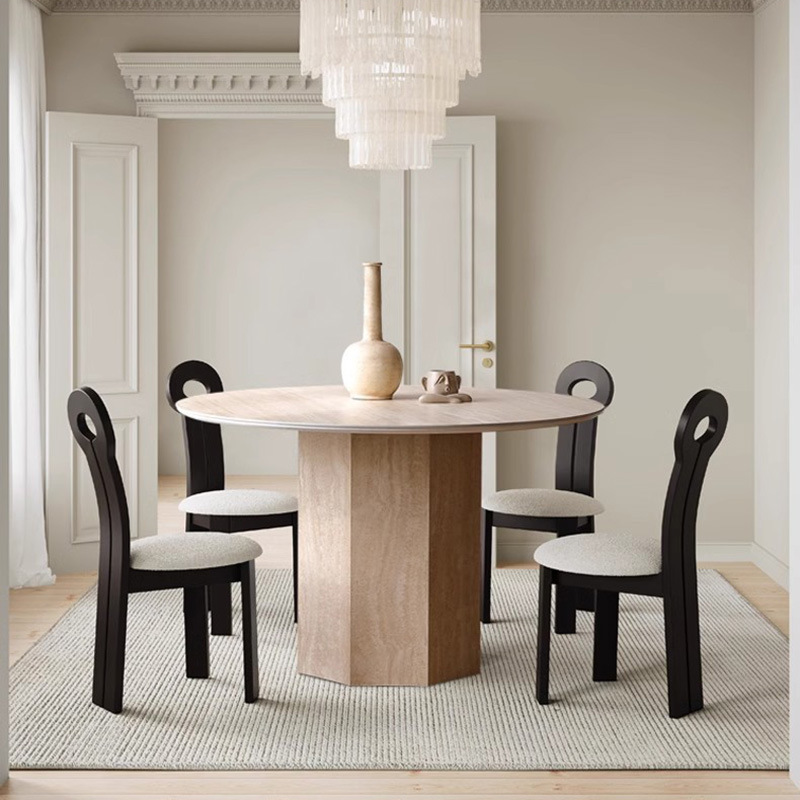 フレンチレトロな半円形のロックプレートダイニングテーブル、小さなアパートメント、ローマンコラム、壁に沿ったペニンシュラテーブル、クリームスタイルのブラックアイランドテーブル