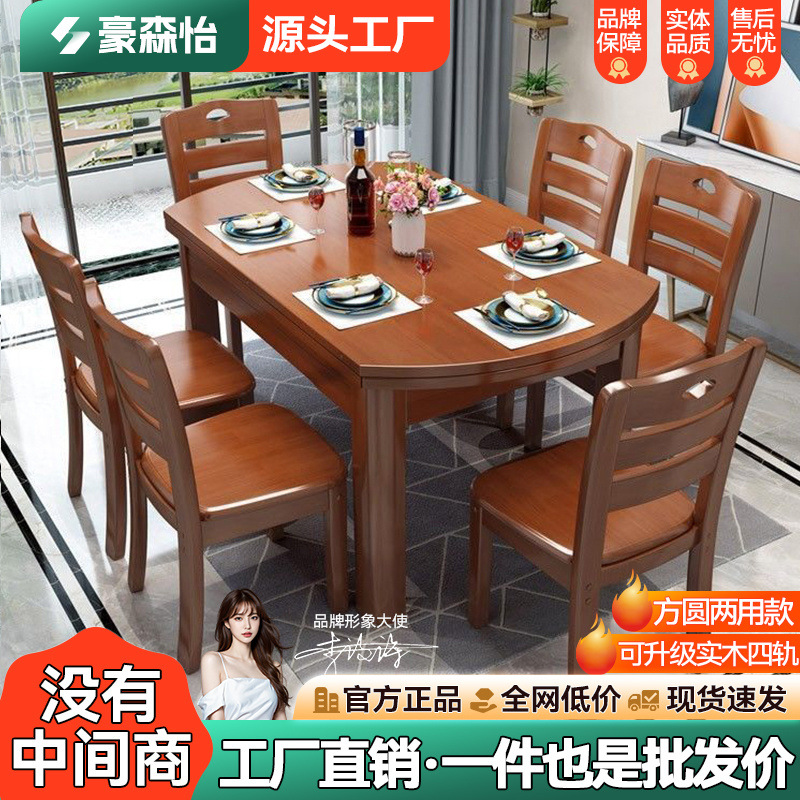 無垢材のダイニングテーブルと椅子の組み合わせ、家庭用小型伸縮式折りたたみ式モダンシンプルなログカラー多人数レストラン大型ラウンドテーブル
