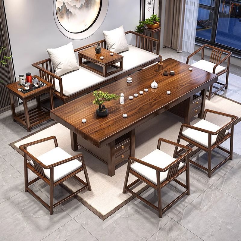 新しい中国風の無垢材の古いニレ材のティーテーブルと椅子の組み合わせ、伸縮式ソファチェア、プッシュプル羅漢ベッド、リビングルームセット