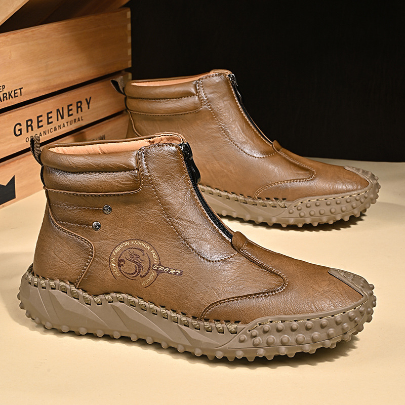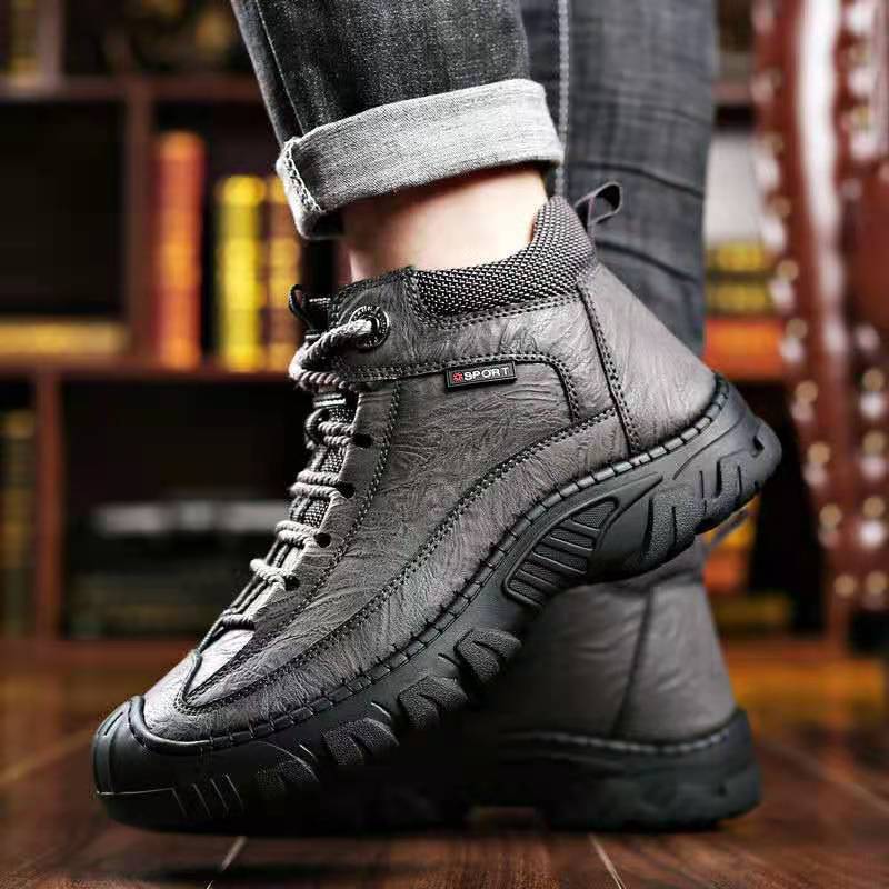 高齢者向けのクロスボーダーレザーシューズ、冬用ベルベットの暖かく厚みのあるウォーキングシューズ、男性用滑り止め中高年綿靴、ハイトップシューズとブーツ