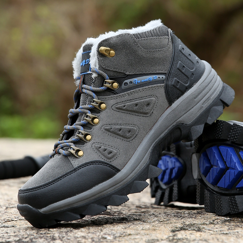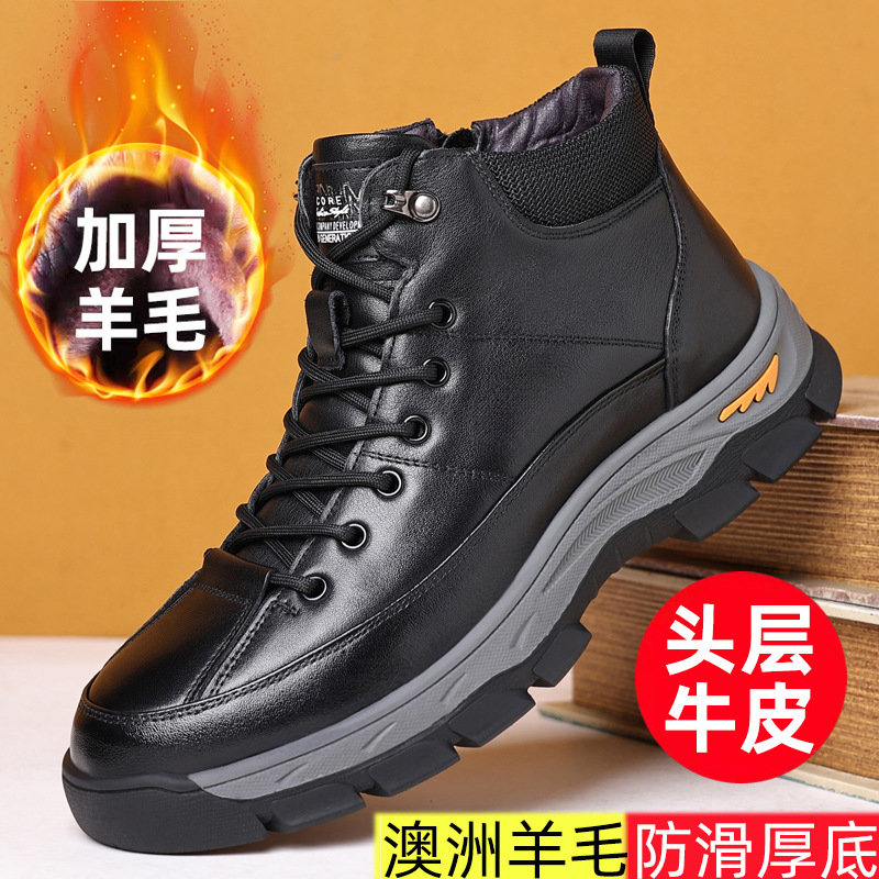 新しいトップ牛革男性毛皮一体綿靴本革ストラップとベルベットの厚い底の登山靴の高組男性靴