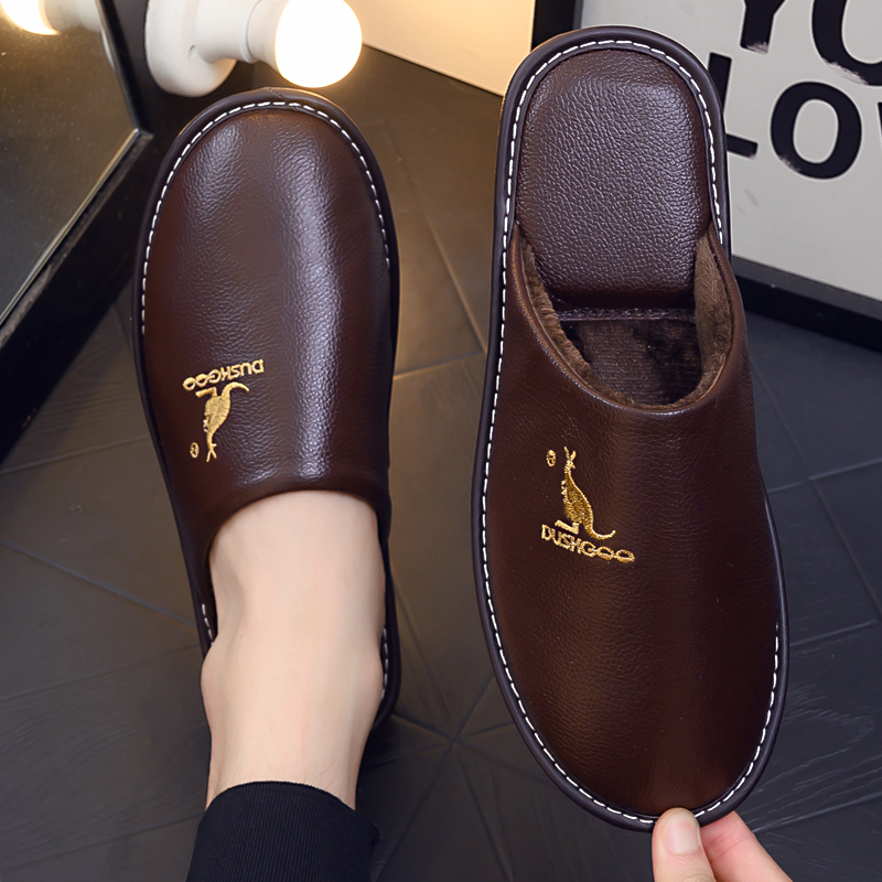 本革ホームコットンスリッパ男性秋冬家室内防水滑り止め厚い底カップル全牛革スリッパ女性冬