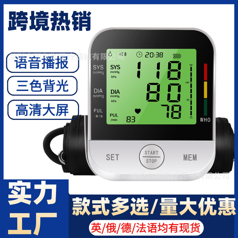 クロスボーダー電気商対外貿易英語三色バックライト全自動血圧計家庭用医療用英語音声アナウンス