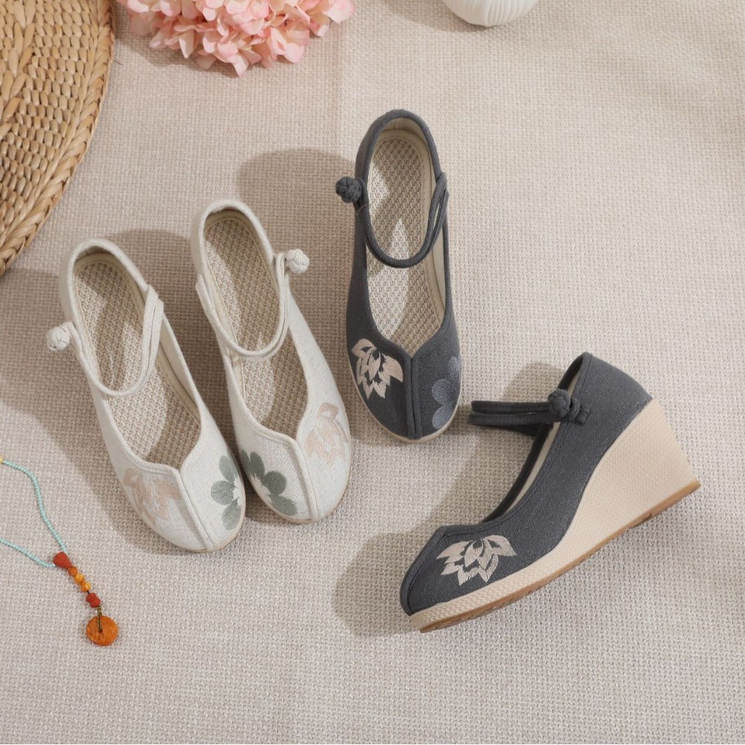 2025春の新型の厚い底の刺繍の靴の古い北京の布の靴の女性の漢服の靴は高くなって心地良い通気性のカジュアルな靴です。