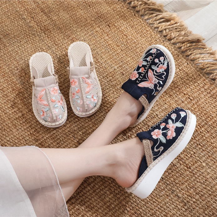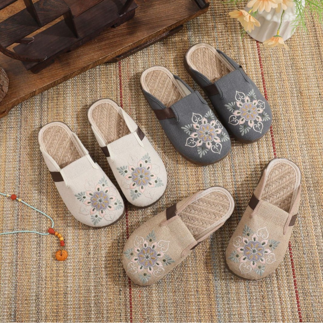 2024新作春夏綿麻の柔らかい底の半分の包頭の女性の刺繍の時代の漢服のスリッパの森の女性の百合のファッションの靴
