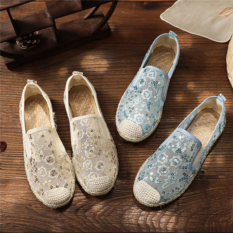 2025 夏中国風の女性の靴古代中国の漢服ダンスシューズメッシュ通気性エスパドリーユエスニックスタイル布靴スリッポン