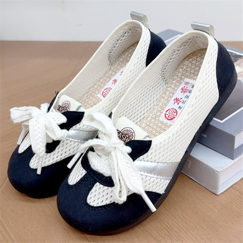 夏の新しいスタイルの古い北京布靴、女性用、レースアップ装飾、ファッショナブルなシングルメッシュシューズ、フレンチバレエフラットシューズ、道徳訓練靴