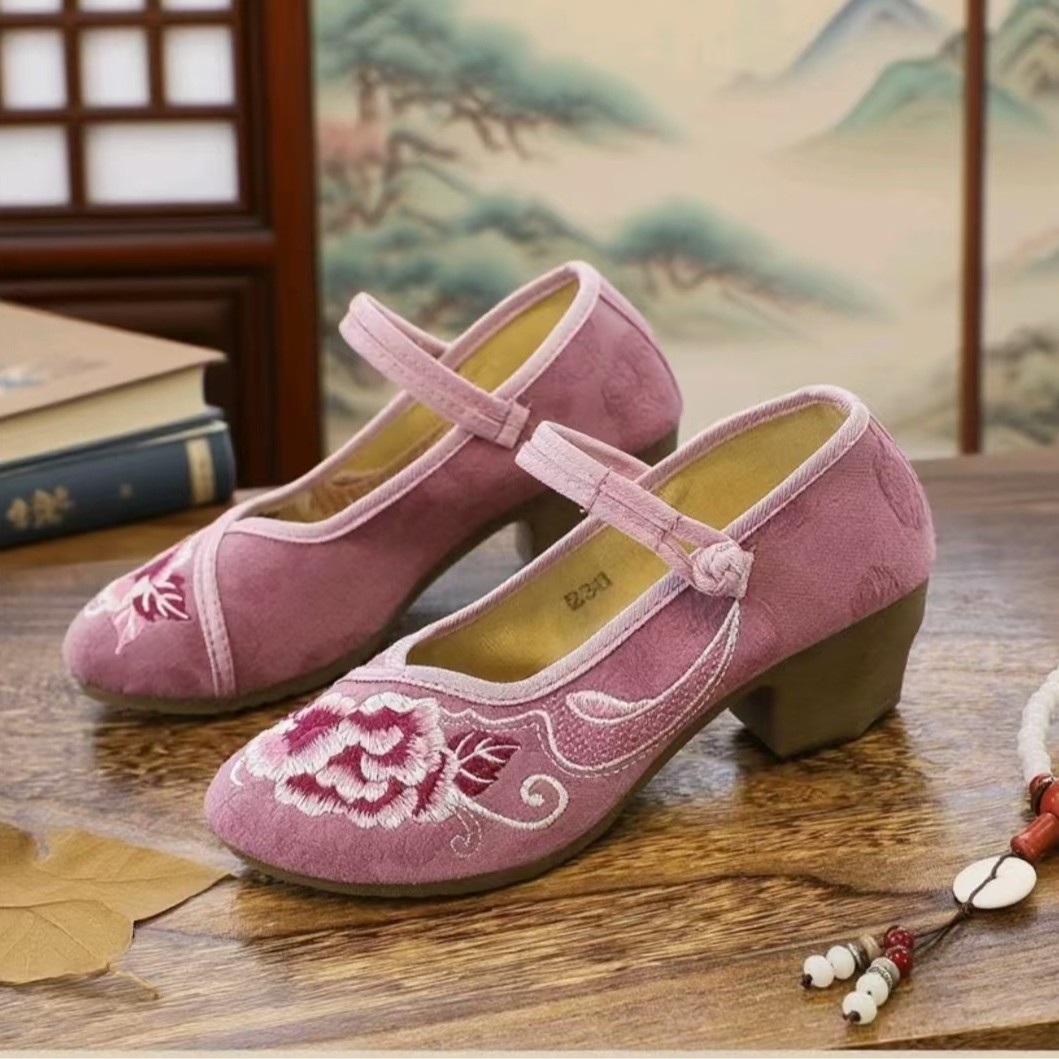 源工場手作り千層底布靴 刺繍バラ柄 中高年女性向けカジュアルシューズ