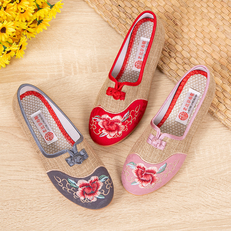 女性用夏用古北京布靴、通気性のある柔らかい底の丸いつま先の女性用漢服刺繍靴、滑り止めのワンステップママシューズ