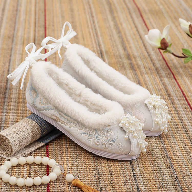 靴/綿の靴の漢服の靴の毛の口とベルベットのビーズのフリンジの時代の鳳凰の刺繍の布の靴の女性の靴は代行します。
