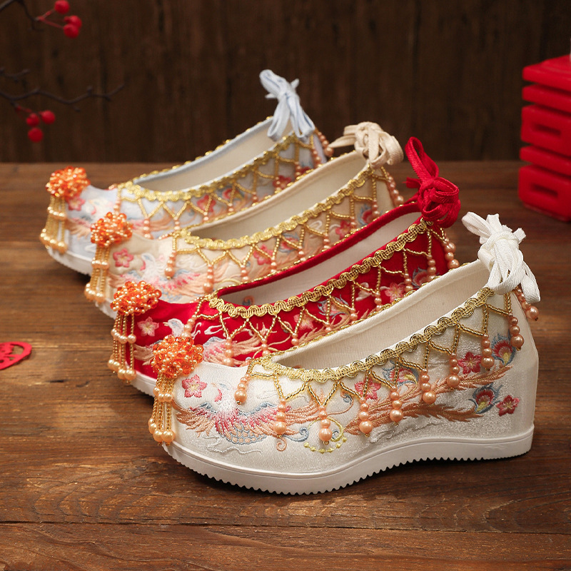 春秋の新型の流蘇の女性の古風の刺繍の靴の赤い新婦の秀禾の結婚の靴の中国式の中で高くなる復古の漢服の靴