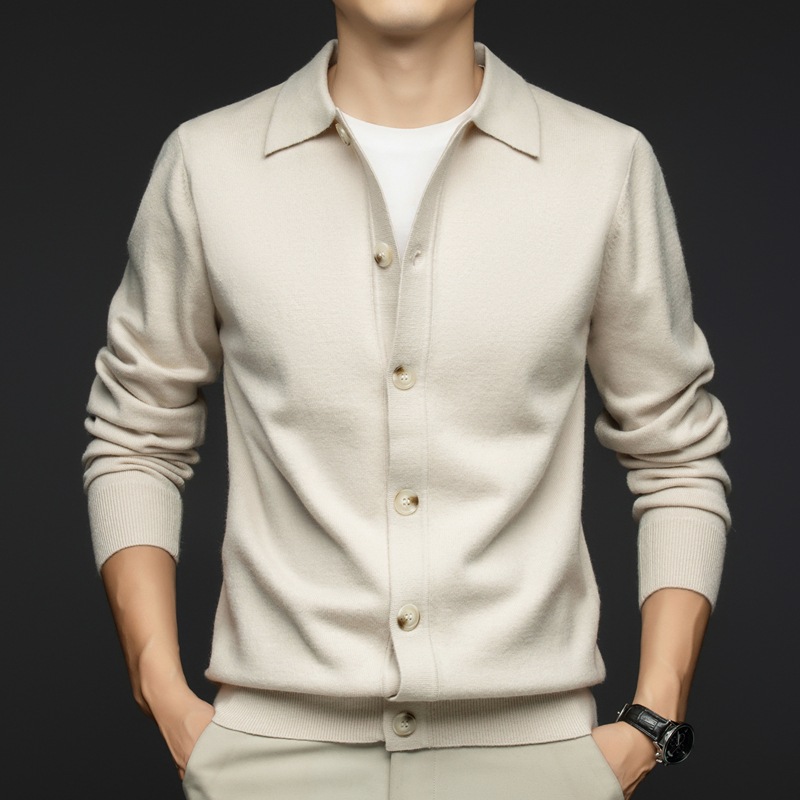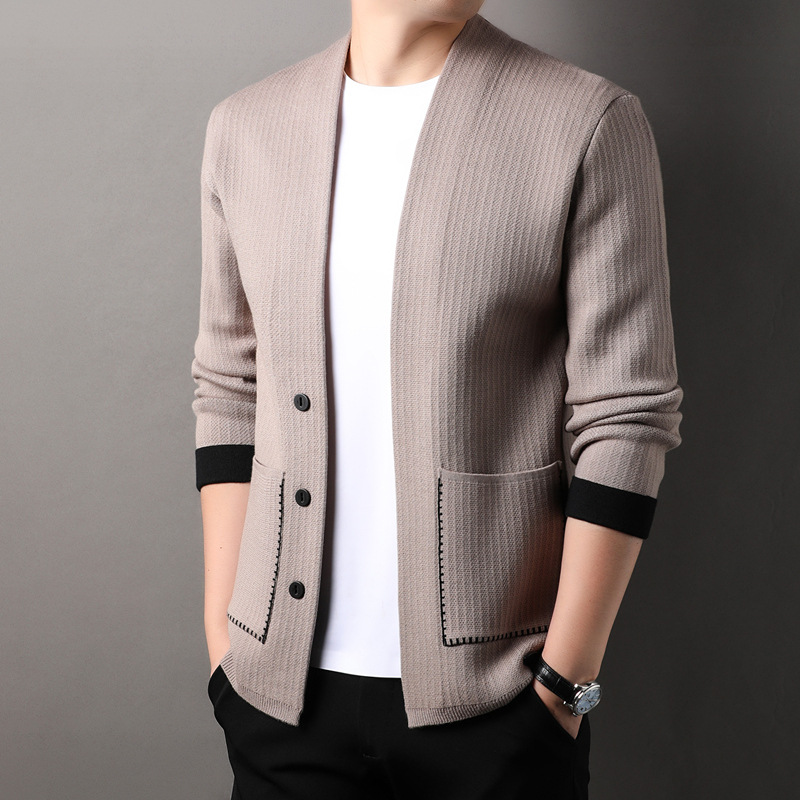 男性v字襟純ウールカーディガン青年保温ニット外着セーターゆったりカジュアル長袖中高年外
