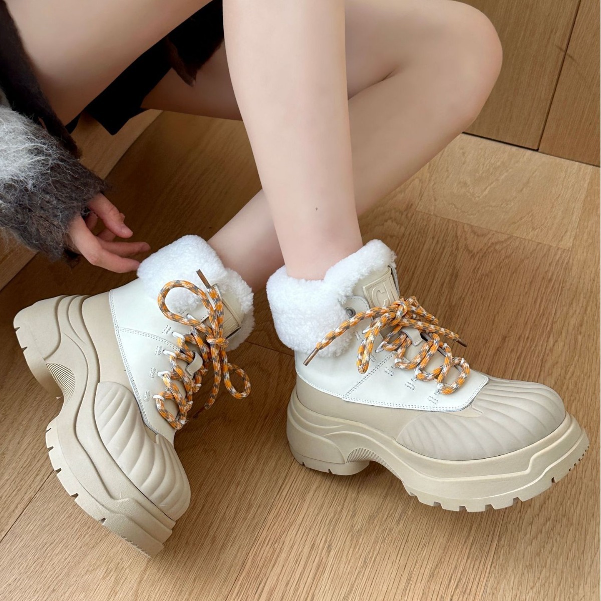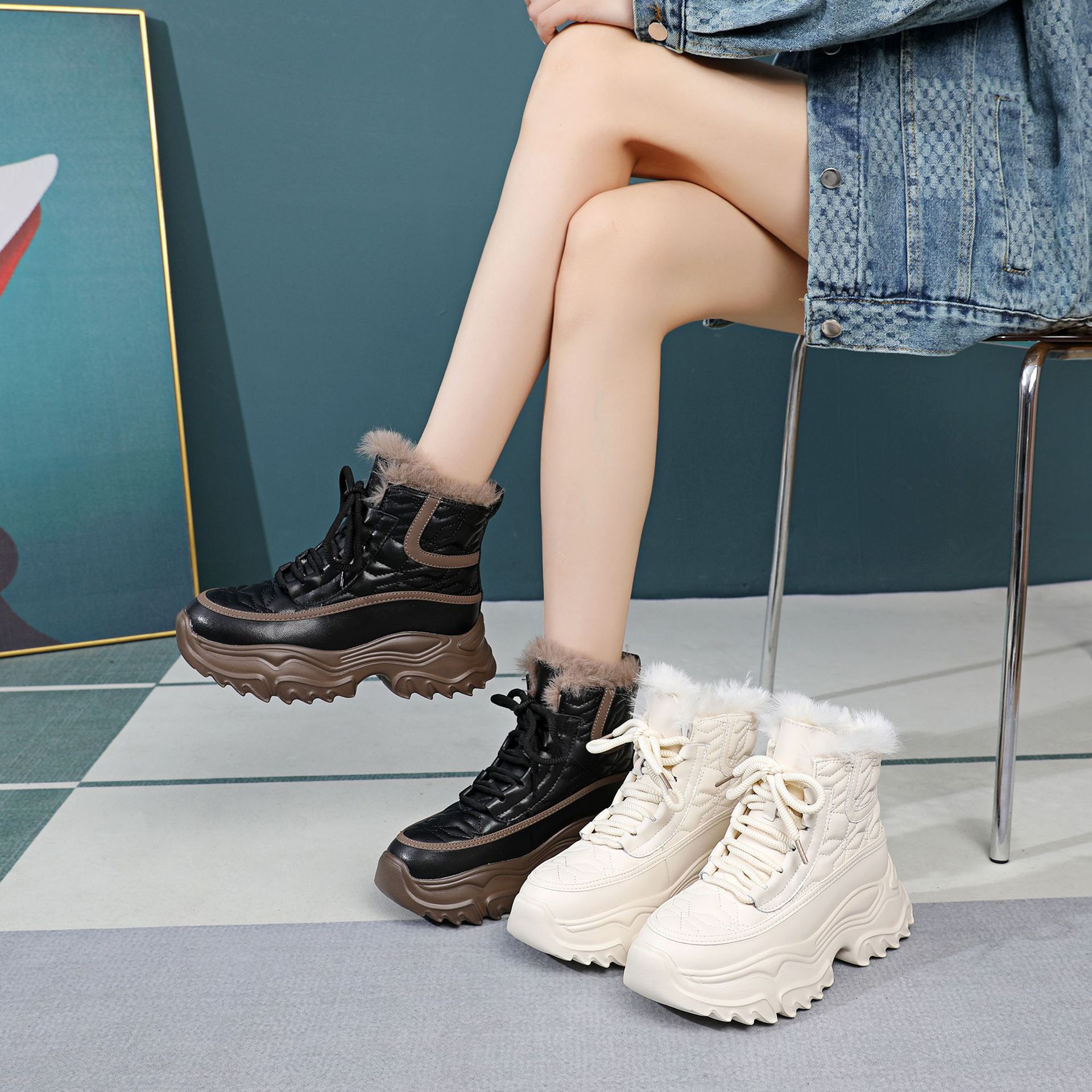 2025年新作 本革 厚底 フリース裏地付き 暖かいウール レディースシューズ キャタピラー風 オールマッチ レザー一体型 スノーブーツ パンシューズ