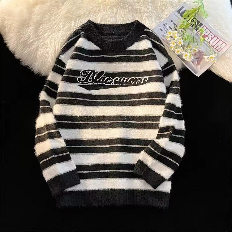 アメリカのレトロで怠惰な縞模様のセーター男性秋冬の新型高級感丸首長袖ニットのファッションカード