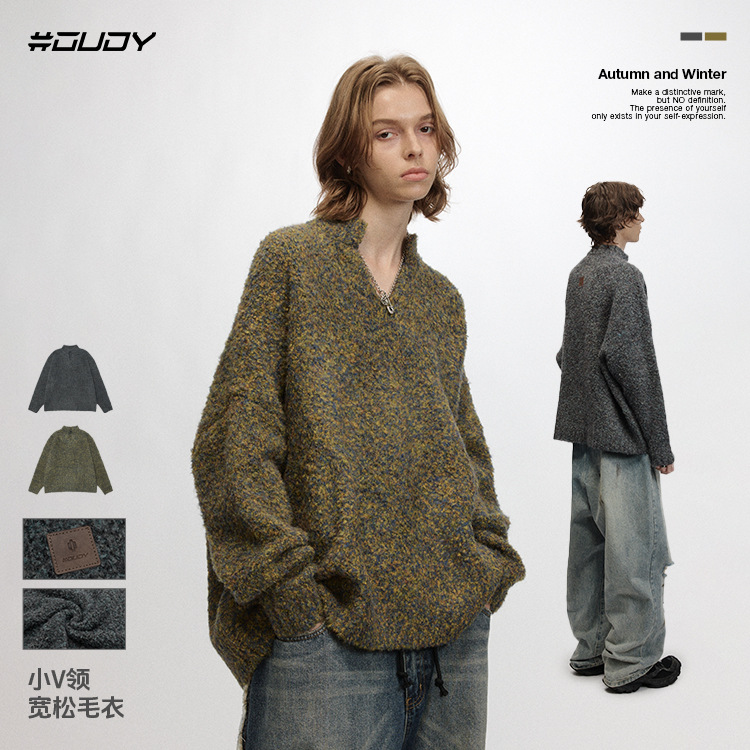 半ファスナー立襟セーター男性秋冬の怠惰なニットジャケット男性の襟が厚くてゆるい上着の潮