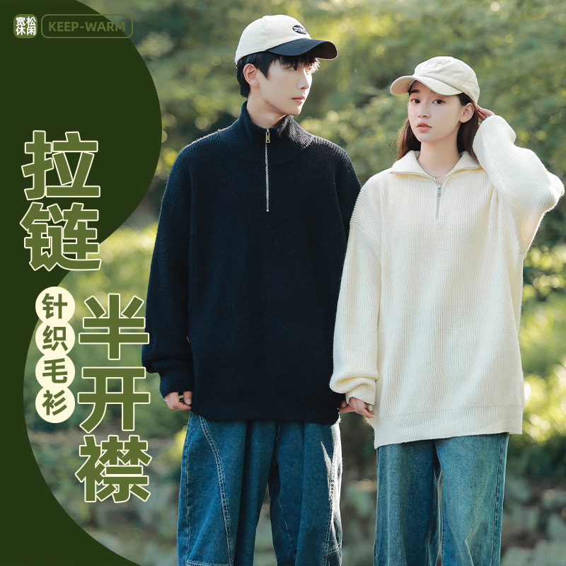 秋と冬の男性用の新しいセーター、シンプルなカップルの怠惰なスタイルのセーター、男性用のルーズな無地のジッパープルオーバーセーター