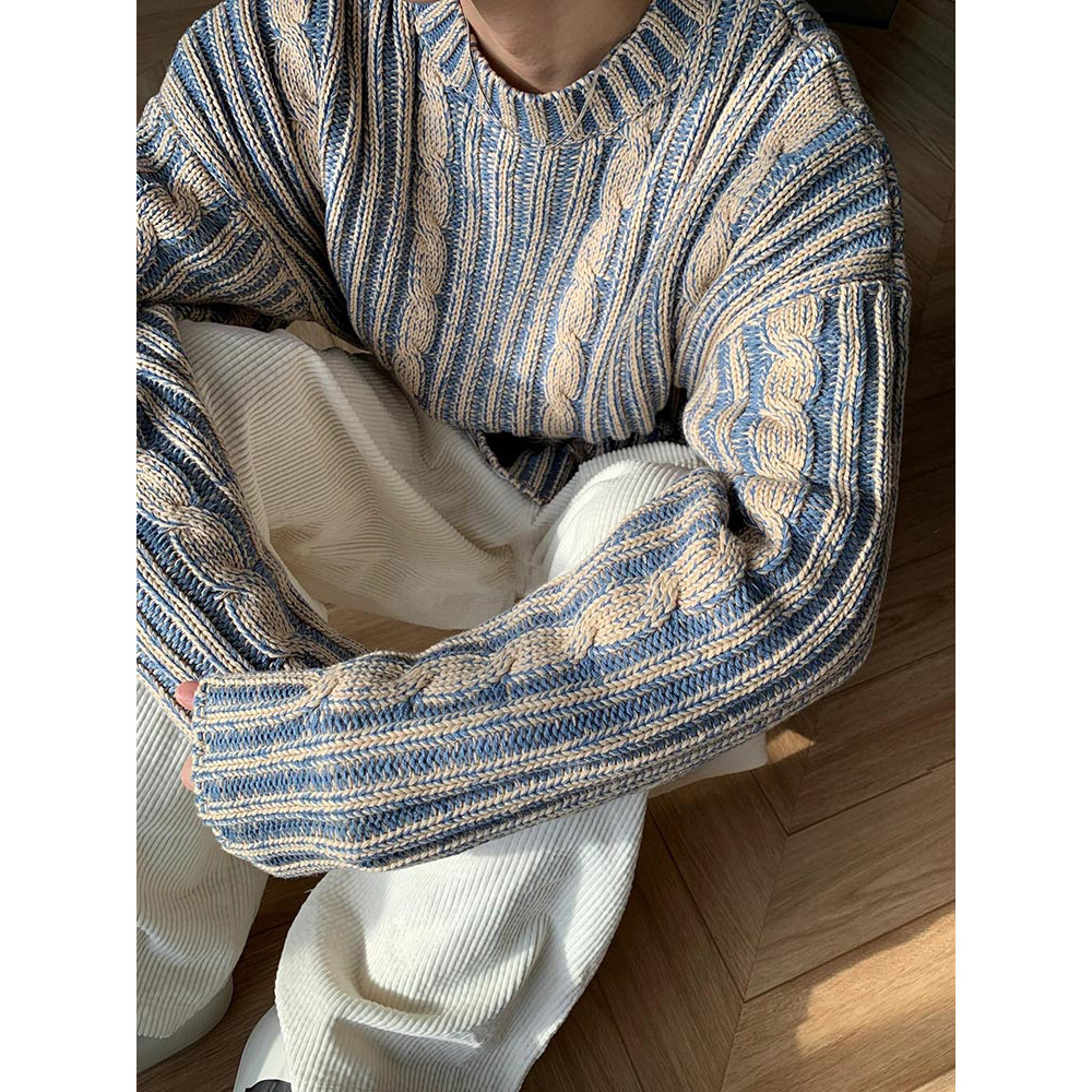 Cleanfit男子高級感セーター秋冬韓系スタイルはレトロな衝突色の丸首カジュアルニットを着ています。