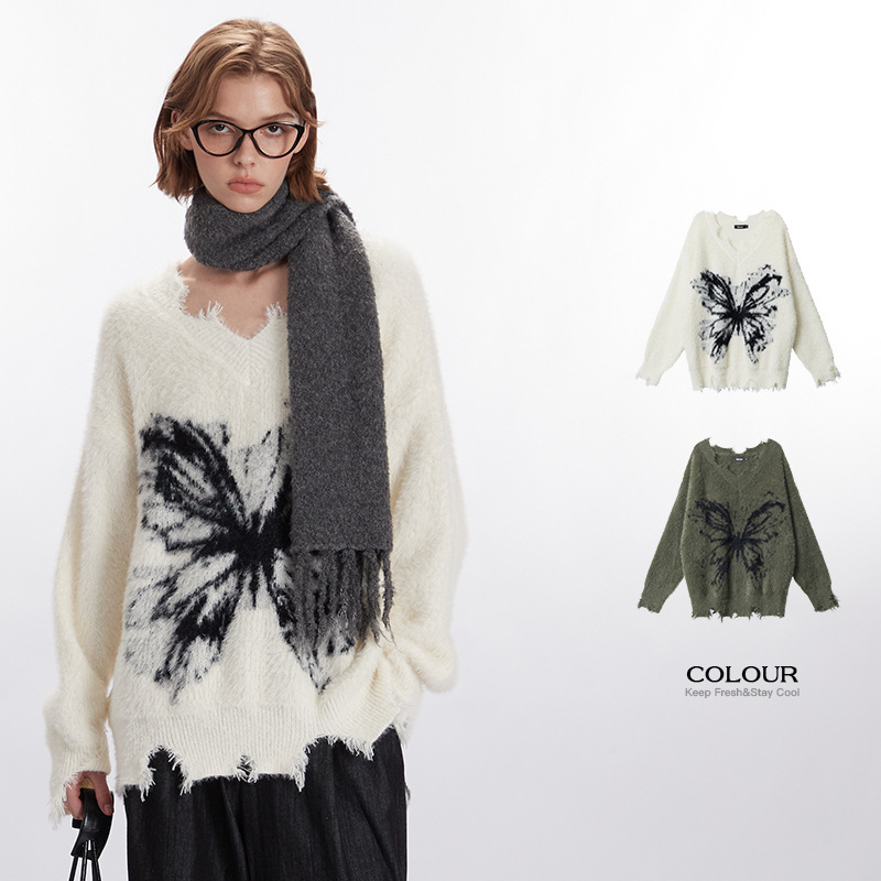 HeyHenry バタフライレイジースタイルラウンドネックプルオーバーセーターレディースアメリカンスタイル 2025 新しい秋冬ルーズニットセーター