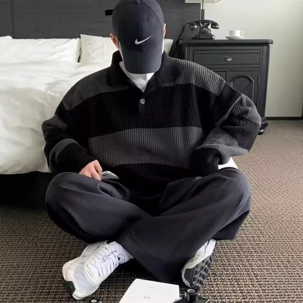 FBUF中性風POLO襟セーター男性冬は黒のセーターを洗うことができます。
