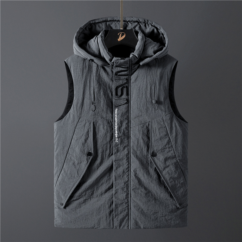 メンズベストコート、綿入りベスト、保温ベスト、トレンディなゆったりスタイル、おしゃれでかっこいいフード付きベスト