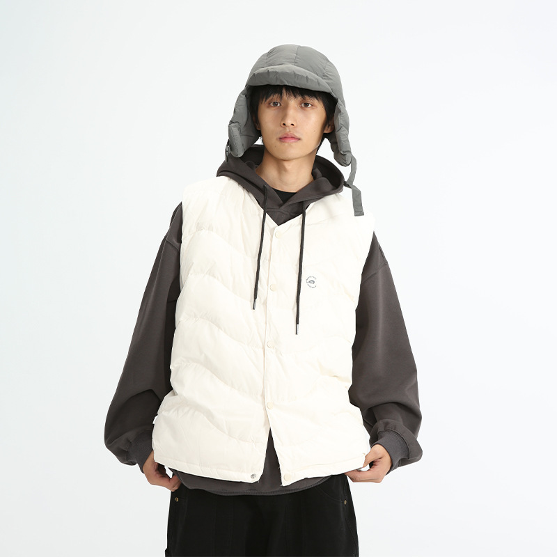 秋冬は帽子付きのダウンベストを脱ぐことができます。