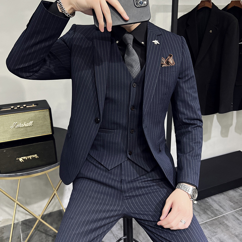 男性スーツの平反駁襟スーツの3点セットビジネス通勤男性カジュアルスーツのストライプスーツ