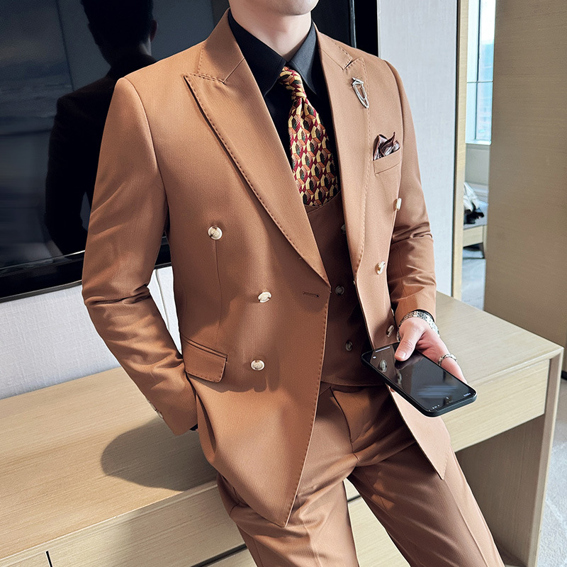 ダブルボタンのスーツの男性のスーツの2025春の新型の垂感の修身のビジネスのスーツの3つのセットのランニング量の現物
