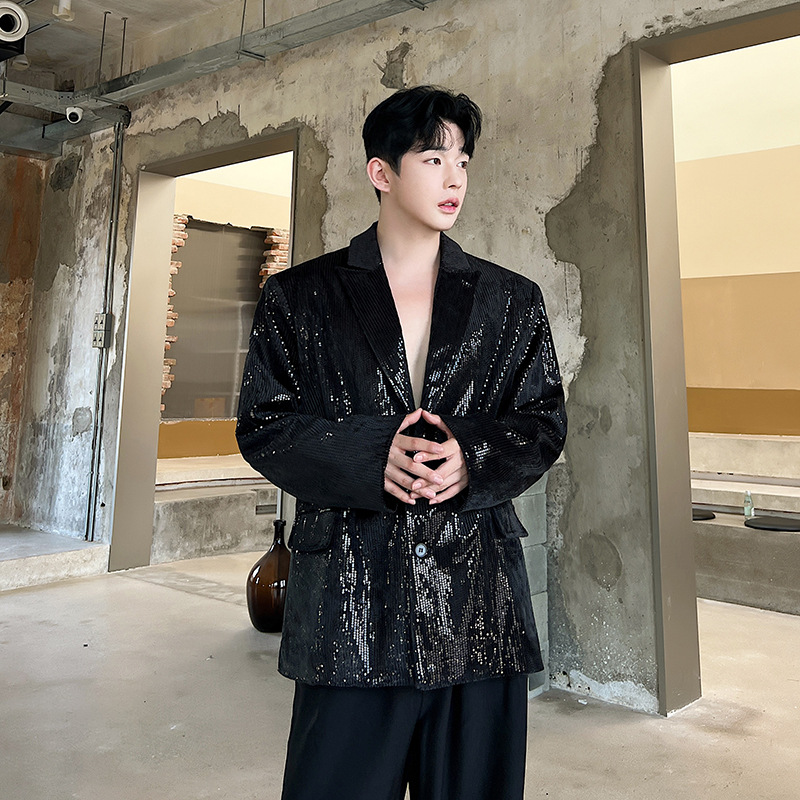 蔡徐坤スターと同じスパンコール街のキラキラスーツのジャケット男性の黒いスーツのトレンドh2025 5130