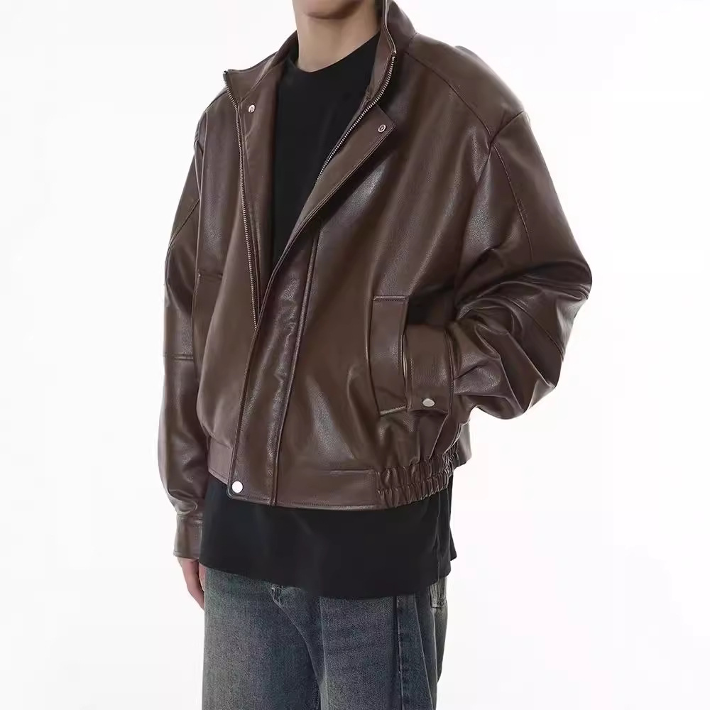 香港風レトロな茶色のpu皮の肩の短い革の服のジャケットの男性の秋冬のアメリカのゆったりした機関車の服のコートのファッション