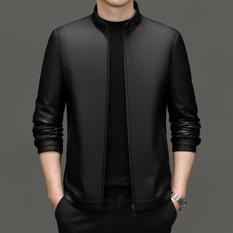 2024男性高級海寧羊皮衣中年ビジネスカジュアル革ジャケット立襟厚いベルベット真皮コート