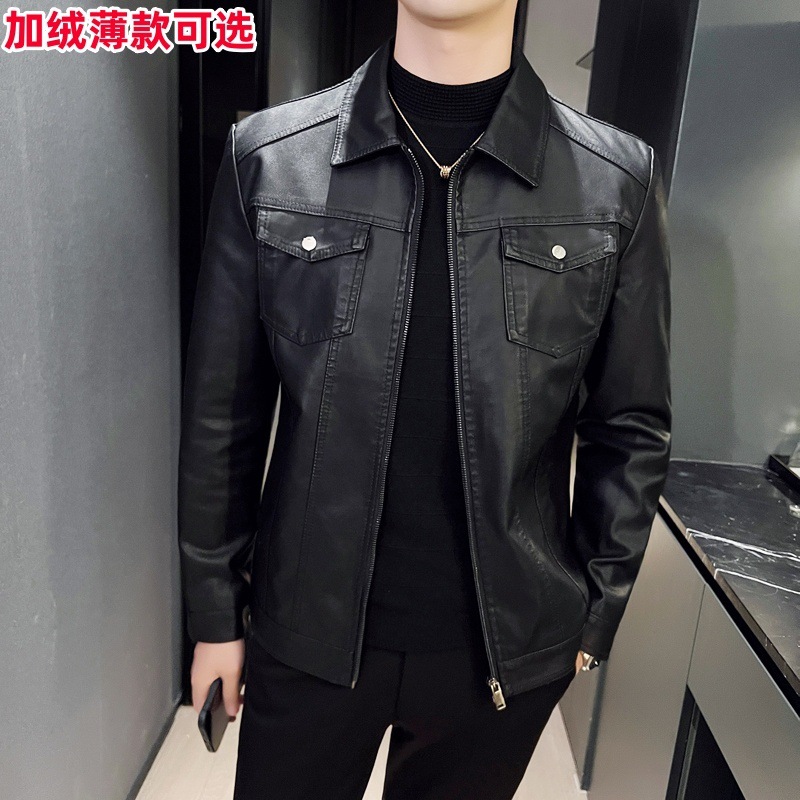 2023春秋韓国版ファッションビジネスカジュアルスーツ襟男性革服PU機関車修身革ジャケット男性服