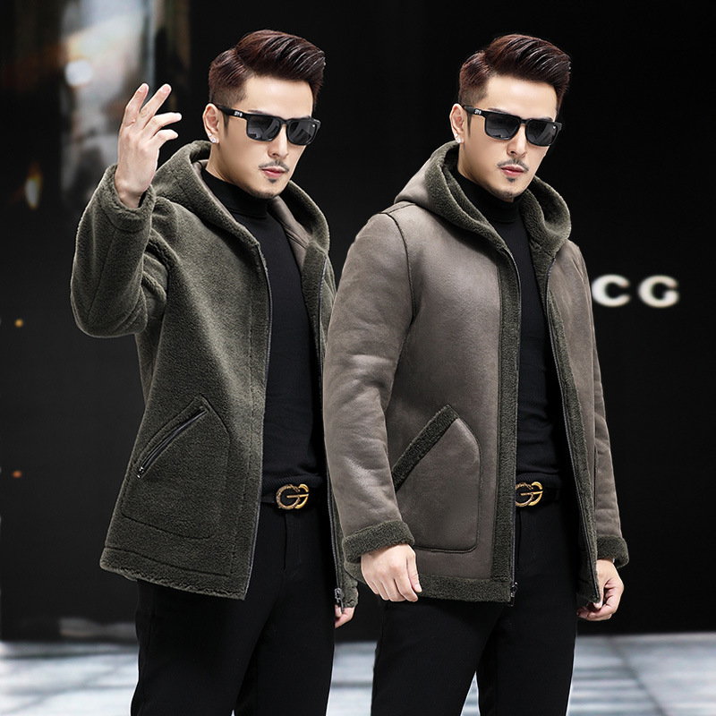 海寧真皮ダウンジャケット男性綿羊皮皮服冬中年男性フード付きダウンジャケットは保温性が高い