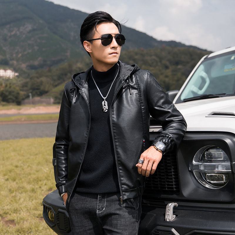 速卖通高級PUレザージャケット フード付きメンズジャケット スリムフィット 薄手裏起毛ジャケット メンズ