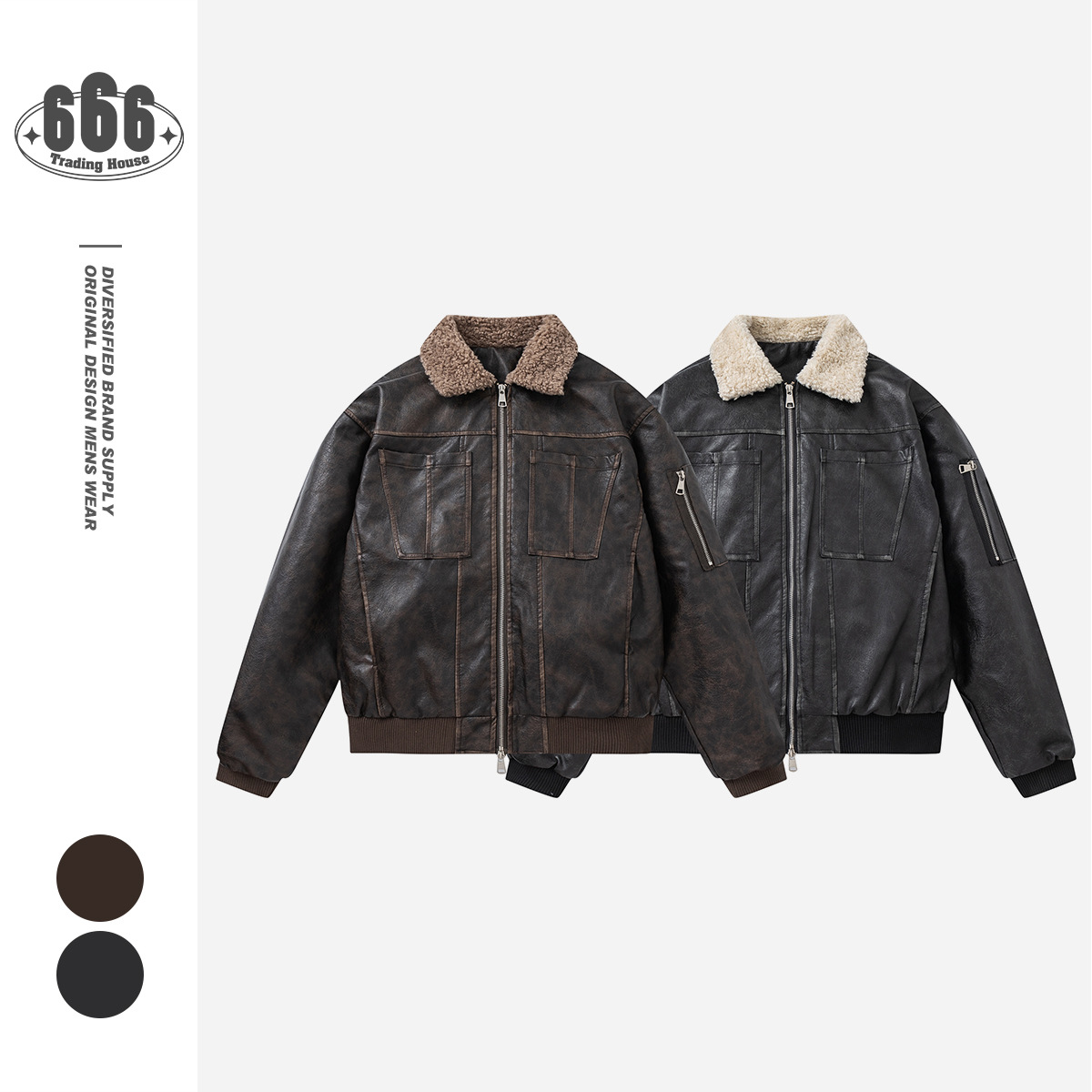 アメリカのファッションブランドのレトロな古い革の服のコートをします。