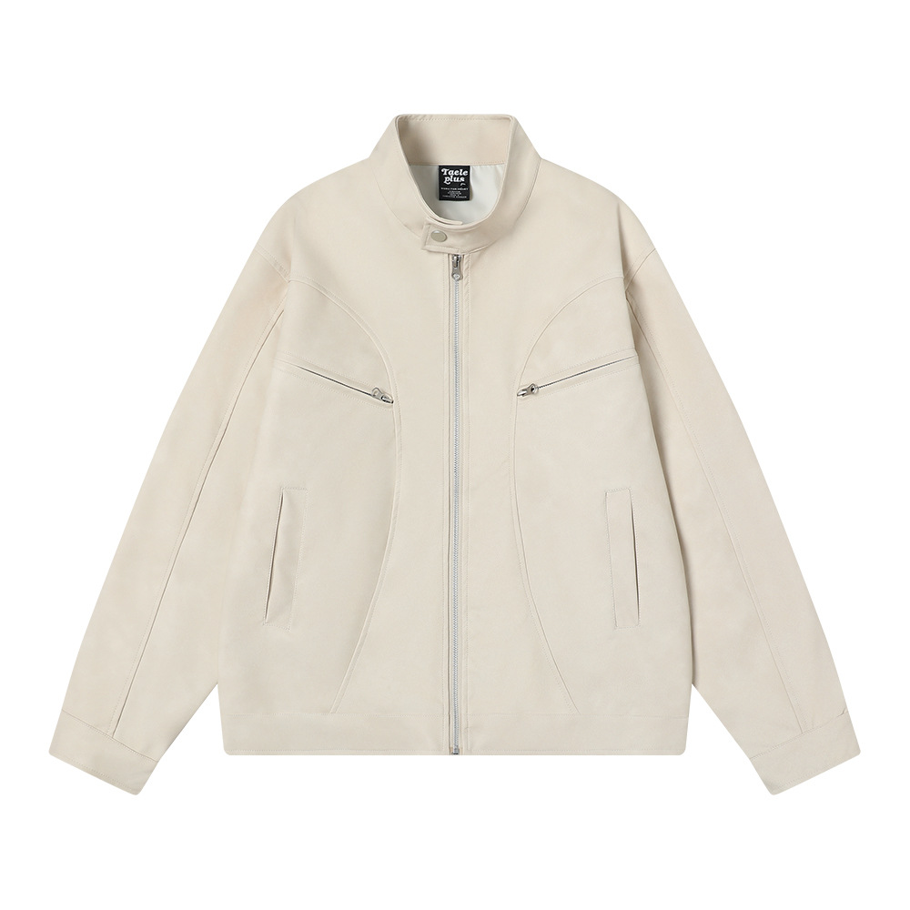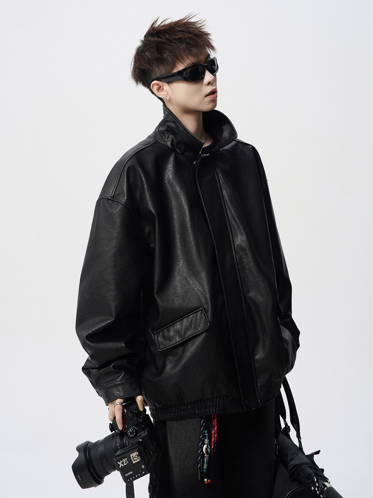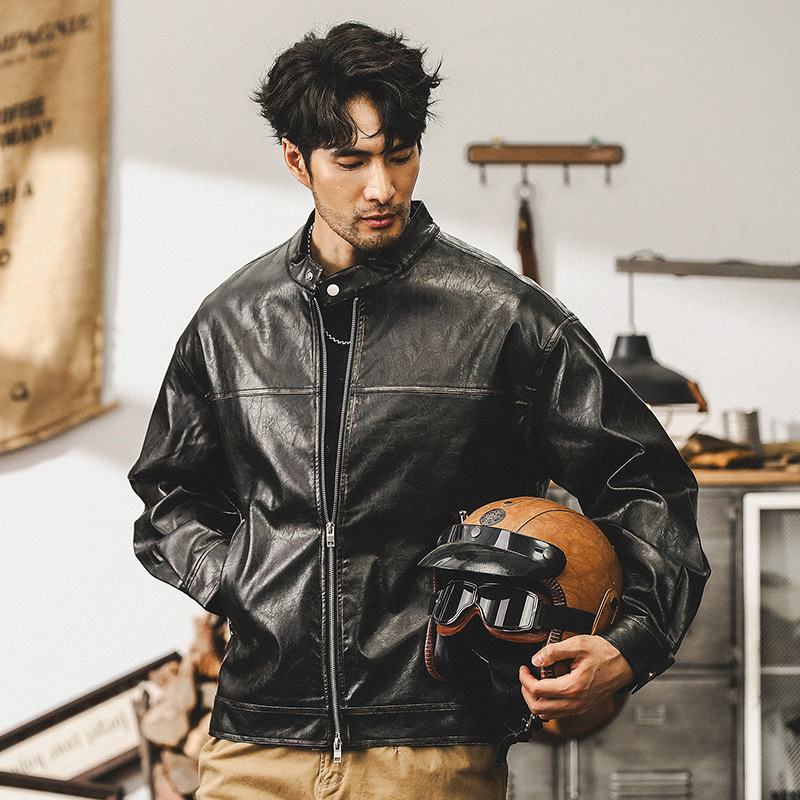 立襟pu皮ジャケット男性パイロット野球服街潮解構造アーチ分割立襟皮服コート